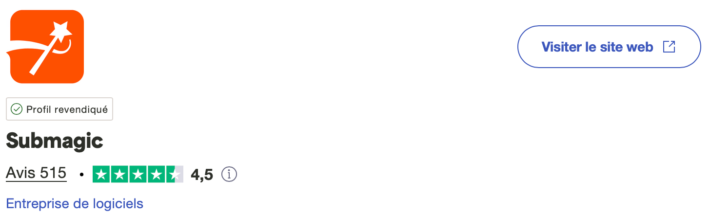 Submagic fait partie des meilleurs outils IA pour ajouter des sous-titres à ses vidéos et les avis des clients suivent tout naturellement. Sur Truspilot, nous retrouvons une note moyenne de 4,5 / 5 pour 515 avis :